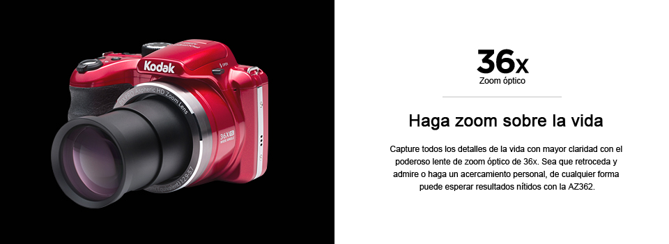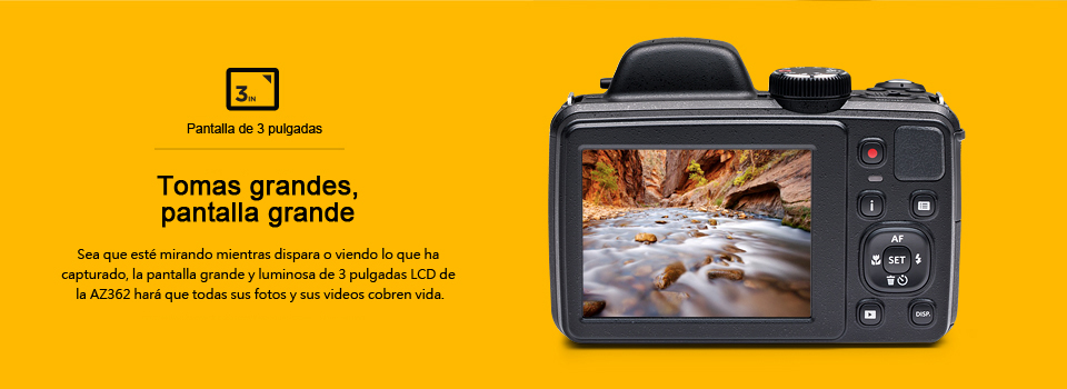 La AZ362 tiene una excelente relación calidad precio por todas las funciones que presenta. Al igual que con nuestra AZ361, usted obtiene un zoom óptico de 36x, y un lente súper gran angular de 24 mm. Pero la AZ362 le permite alcanzar imágenes panorámicas completas de 360 grados y video full HD. Además, con el sensor CMOS de 16 MP usted cuenta con una velocidad de obturación más rápida y disparos de ráfagas múltiples continuos.